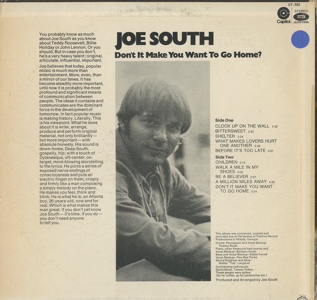 Discographie von Joe South![]() Capitol ST 392 Joe South Dont It Make You Want To Go Home Eintrag bei DISCOGS (extern) US 1970, LP, Pop/Rock Aufnahme: Stereo Zustand: vg / vg+ sowie Walk A Mile in My Shoes, Children, Clock Up On The Wall u.a.m. Preis in Euro: 4,00 € Verfügbarkeitsanfrage | ![]() Coveransicht: Joe South - Dont It Make You Want To Go Home ![]()