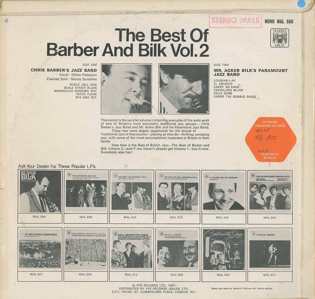Discographie von Barber & Bilk![]() Marble Arch MALS 688 Barber & Bilk The Best of Barber and Bilk Volume II Eintrag bei DISCOGS (extern) UK RI 1967 (Orig.1961, LP, Jazz Aufnahme: Stereo Zustand: vg+ / vg+ (Kanten gekklebt, Price Sticker auf Rücks.) Aufnahmen von 1958 - 1961 Chris Barber: Bugle Call Rag,Beale Street Blues, mAgnolia´s Wedding Day, Petite Fleur, Bye And Bye//Mr. acker Bilk: Louisian-i-ay, El Abanico, Carry Me Back, Travelling Blues, Delia Gone, Under the Double Eagle Preis in Euro: 4,00 € Verfügbarkeitsanfrage | ![]() Coveransicht: Barber & Bilk - The Best of Barber and Bilk Volume II ![]()