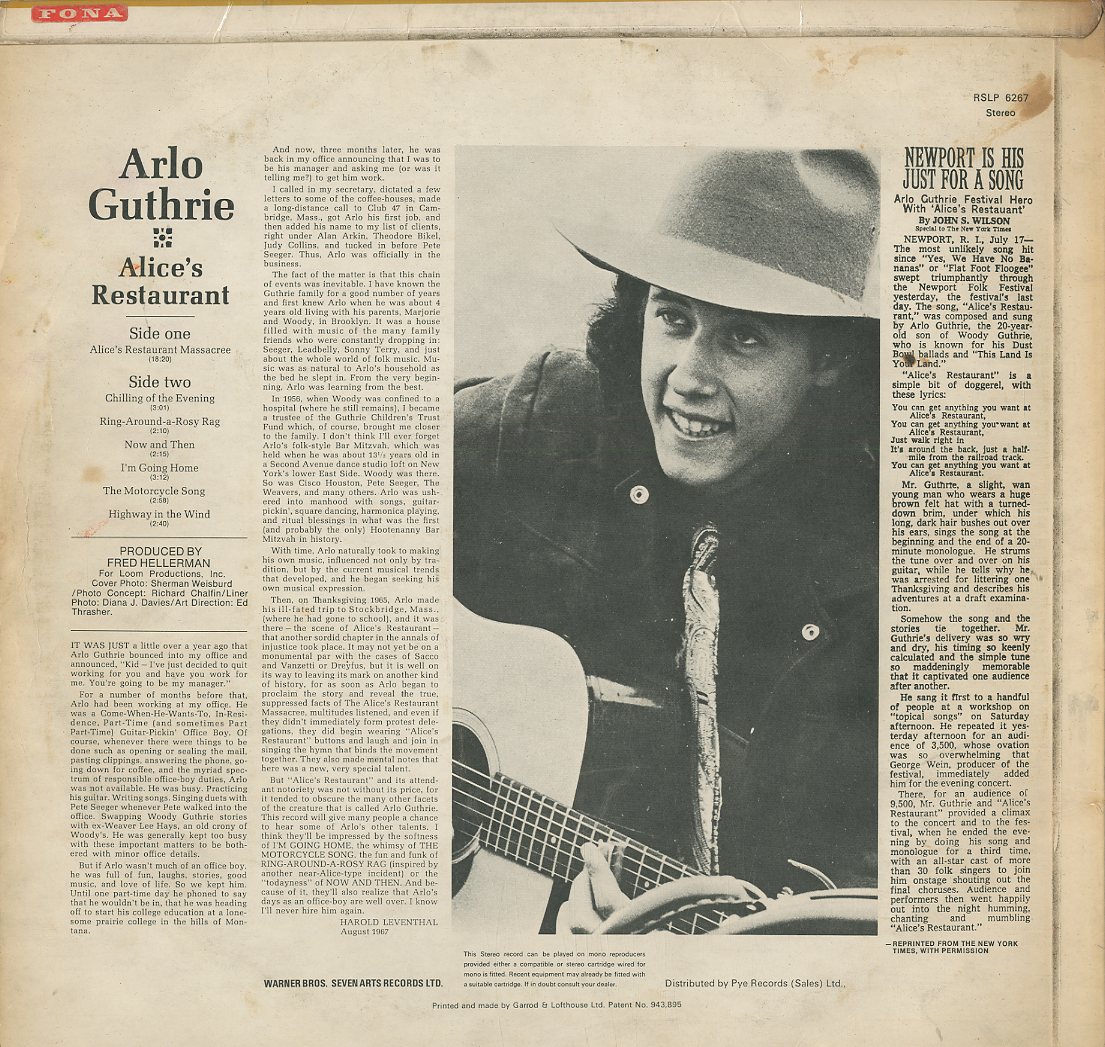 Discographie von Arlo Guthrie![]() Reprise RSLP 6267 Arlo Guthrie Alice´s Restaurant Eintrag bei DISCOGS (extern) UK 1967, LP, Pop/Rock Aufnahme: Stereo Zustand: vg+ / vg sowie Chilling Of The Evening, Highway In The Wind u.a. Preis in Euro: 4,50 € Verfügbarkeitsanfrage | ![]() Coveransicht: Arlo Guthrie - Alice´s Restaurant