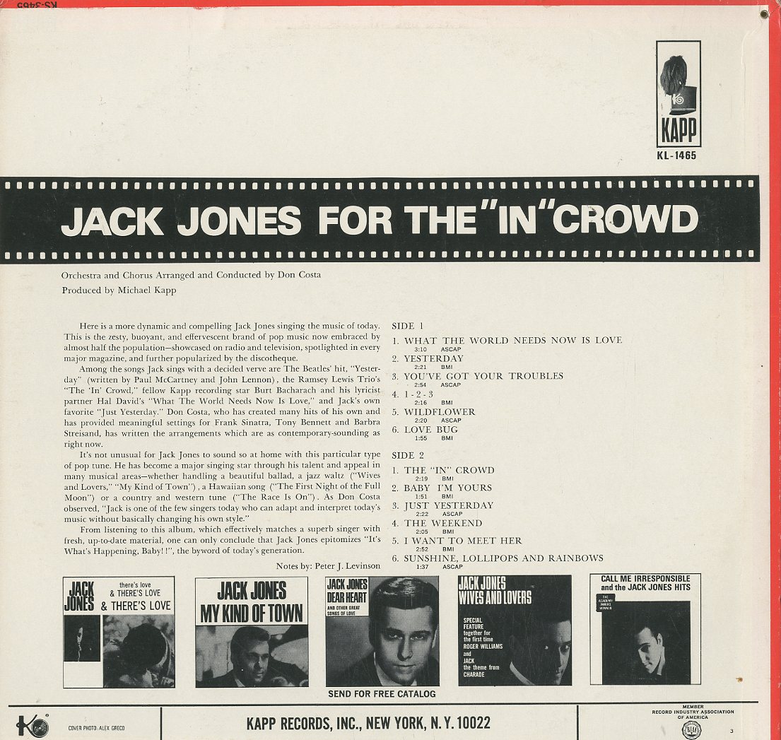 Discographie von Jack Jones![]() Kapp KL 1465 Jack Jones For The "In" Crowd Eintrag bei DISCOGS (extern) US 1966, LP, Easy Listening Aufnahme: Mono Zustand: vg+ / vg+(cut out - kl. Loch) sowie Baby I´m Yours, Yesterday, You´ve Got Your Troubles u.a. Preis in Euro: 4,50 € Verfügbarkeitsanfrage | ![]() Coveransicht: Jack Jones - For The "In" Crowd ![]()