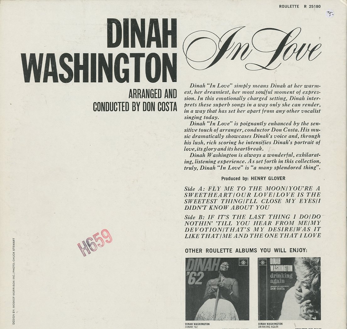 Discographie von Dinah Washington![]() Roulette R 25 180 Dinah Washington In Love Eintrag bei DISCOGS (extern) US 1962, LP, Easy Listening Aufnahme: Mono Zustand: m- / mint -, in Roulette Innenhülle mit Fly Me To The Moon, That´s My Desire u.a. Preis in Euro: 15,00 € Verfügbarkeitsanfrage | ![]() Coveransicht: Dinah Washington - In Love ![]()