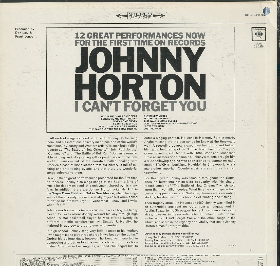| Discographie von Johnny Horton Columbia CS 9099 Johnny Horton I Cant Forget You - 12 Great Performances Now Forn Then First Time On Records Eintrag bei DISCOGS (extern) US 1964, LP, C&W/Folk Aufnahme: Stereo Zustand: vg+ + / vg++ sowie Out In New Mexico, I Love You Baby u.a.m. Preis in Euro: 7,00 € Verfügbarkeitsanfrage | ![]() Coveransicht: Johnny Horton - I Cant Forget You - 12 Great Performances Now Forn Then First Time On Records ![]()