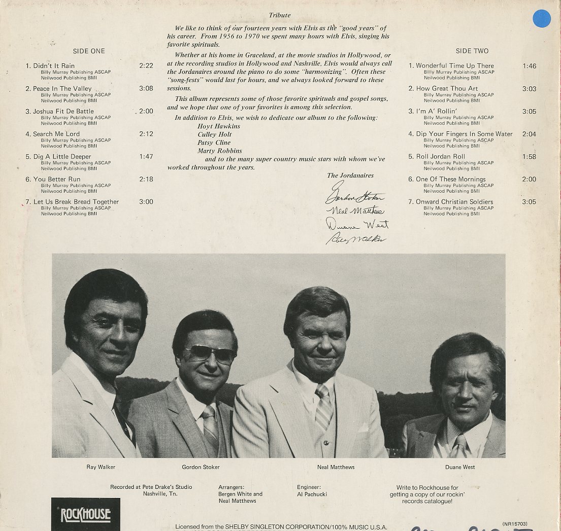 Discographie von Jordanaires Rockhouse LPL 8505 Jordanaires Sing Elvis´ Favorite Spirituals Eintrag bei DISCOGS (extern) NL 1985, LP, US-Rock Aufnahme: Stereo Zustand: vg+ / Cover vg- (vorne besch.) (Foto) mit Didnt It Rain, Josuah Fit de Battle, Wonderful Time Up There u.a.m. Preis in Euro: 4,00 € Verfügbarkeitsanfrage | ![]() Coveransicht: Jordanaires - Sing Elvis´ Favorite Spirituals ![]()