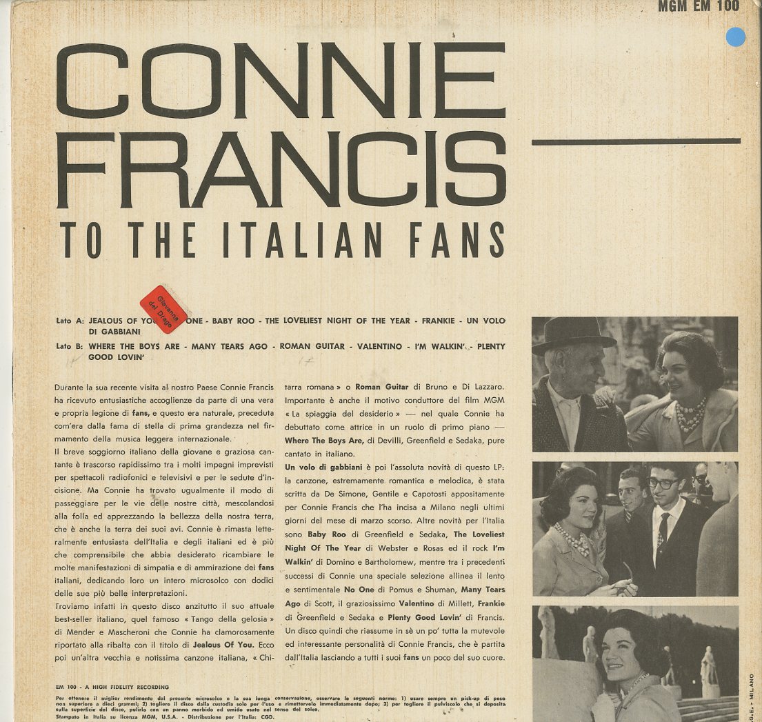 Discographie von Connie Francis![]() MGM EM 100 Connie Francis To The Italian Fans Eintrag bei DISCOGS (extern) IT k.A., LP, US-Rock Aufnahme: Mono Zustand: vg / vg+ mit Frankie, Un Volo Di Gabbiani, Where The Boys Are, Roman Guitar, Valentino u.a.m. Preis in Euro: 4,00 € Verfügbarkeitsanfrage | ![]() Coveransicht: Connie Francis - To The Italian Fans ![]()