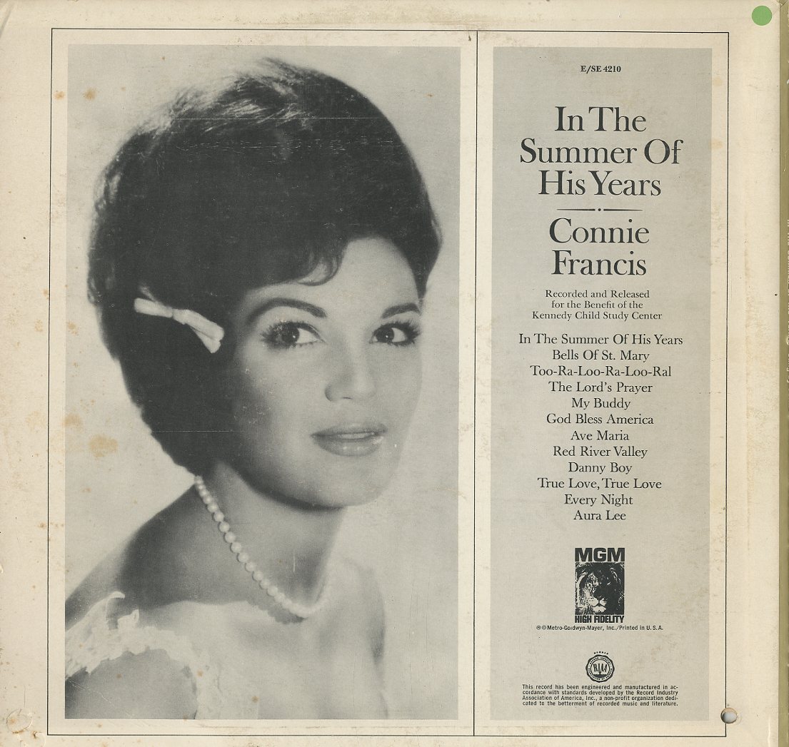 Discographie von Connie Francis![]() MGM SE 4210 Connie Francis In The Summer Of His Years Review der Schallplatte (extern) Eintrag bei DISCOGS (extern) US 1964, LP, US-Rock Aufnahme: Stereo Zustand: vg / Cover vg (Cut Out, kl. Loch unten links), Ecke geknickt, Rückseite leicht verschmutzt Recorded and released for the benefit of the Kennedy Child Study Center Der Titelsong ist eine Hommage an den ermordeten John F. Kennedy + 11 andere Titel wie z.B. Danny Boy, Ave Maria, Aura Lee (1959 - 1963) Zur Geschichte des Songs: http://en.wikipedia.org/wiki/In_the_Summer_of_His_Years_%28song%29 (Connie Francis war die dritte Interpretin) Ermordung November 1963, LP erschienen Dezember 1963 Preis in Euro: 2,50 € Verfügbarkeitsanfrage | ![]() Coveransicht: Connie Francis - In The Summer Of His Years ![]()
