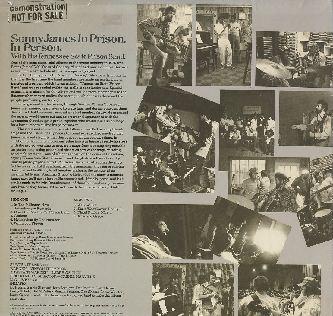 Discographie von Sonny James![]() Columbia KC34708 Sonny James Sonny James In Prison In Person Eintrag bei DISCOGS (extern) US 1977, LP, C&W/Folk Aufnahme: Stereo Zustand: m- / Cover vg+ Rückseite: demonstration, not for sale mit Abilene. Heartaches By The Number, Pistol Pickin Mama, Amazing Grace, Waking Tall u.a. mit Zusatzblatt CBS Biography Band Members are exclusively made of inmates of Tennessee State Prison Preis in Euro: 6,00 € Verfügbarkeitsanfrage | ![]() Coveransicht: Sonny James - Sonny James In Prison In Person ![]()