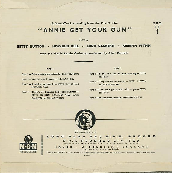 Discographie von Annie Get Your Gun MGM CD 1 Annie Get Your Gun Unforgettable Irving Berlin Tunes from the Soundtrack of the MGM Film Annie Get Your Gun (25 cm) Eintrag bei DISCOGS (extern) UK (1950), LP, Soundtracks Aufnahme: Mono Zustand: vg+ bis m- / vg+ mit Betty Hutton, Howard Keel, Louis Calhern, Keenan Wynn ua. Preis in Euro: 4,00 € Verfügbarkeitsanfrage | ![]() Coveransicht: Annie Get Your Gun - Unforgettable Irving Berlin Tunes from the Soundtrack of the MGM Film Annie Get Your Gun (25 cm) ![]() |