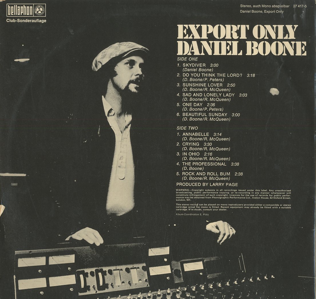 Discographie von Daniel Boone Bellaphon Penny Farthing 27 417 Club Sonderaufl. Daniel Boone Export Only Eintrag bei DISCOGS (extern) D 1973, LP, Pop/Rock Aufnahme: Stereo Zustand: m- / vg++ u.a. Beautiful Sunday, Skydiver, Annabelle, Crying (Boone) Preis in Euro: 5,00 € Verfügbarkeitsanfrage | ![]() Coveransicht: Daniel Boone - Export Only ![]()