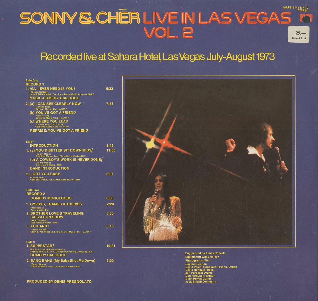 Discographie von Sonny & Cher![]() MCA Records MAPS 7141 Sonny & Cher Live in Las Vegas Vol. 2 (DLP) Review der Schallplatte (extern) Eintrag bei DISCOGS (extern) D 1973, LP, Pop/Rock Aufnahme: Stereo Zustand: vg+ + / m- u.a. All I Ever Need Is You, Bang Bang, I Got You Babe Klappcover mit Farbfotos Recorded live at Sahara Hotel, Las Vegas July-August 1973 Diese Platte ist zur Zeit vergriffen. | ![]() Coveransicht: Sonny & Cher - Live in Las Vegas Vol. 2 (DLP) ![]()
