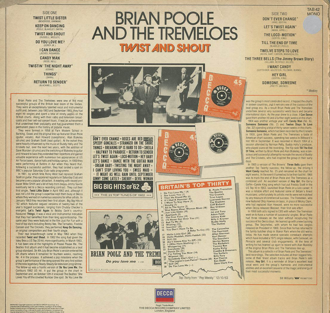 Discographie von Brian Poole & The Tremeloes![]() Decca TAB 42 Brian Poole & The Tremeloes Twist And Shout (Compil. Diff. tracks) Eintrag bei DISCOGS (extern) UK 1982, LP, GB-Rock Aufnahme: Mono Zustand: vg+ bis m- / vg sowie Do You Love Me, I Can Dance, Cand Man, Lets Twist Again u.a. Preis in Euro: 7,00 € Verfügbarkeitsanfrage | ![]() Coveransicht: Brian Poole & The Tremeloes - Twist And Shout (Compil. Diff. tracks) ![]()