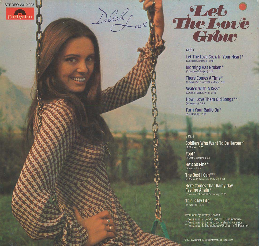 Discographie von Daliah Lavi![]() Polydor 2310 295 Daliah Lavi Let The Love Grow Eintrag bei DISCOGS (extern) D 1973, LP, Easy Listening Aufnahme: Stereo Zustand: vg+ / vg+ sowie Morning Has Broken, Sealed With A Kiss, Turn Your Radio On u.a. Preis in Euro: 5,00€ Verfügbarkeitsanfrage | ![]() Coveransicht: Daliah Lavi - Let The Love Grow ![]()