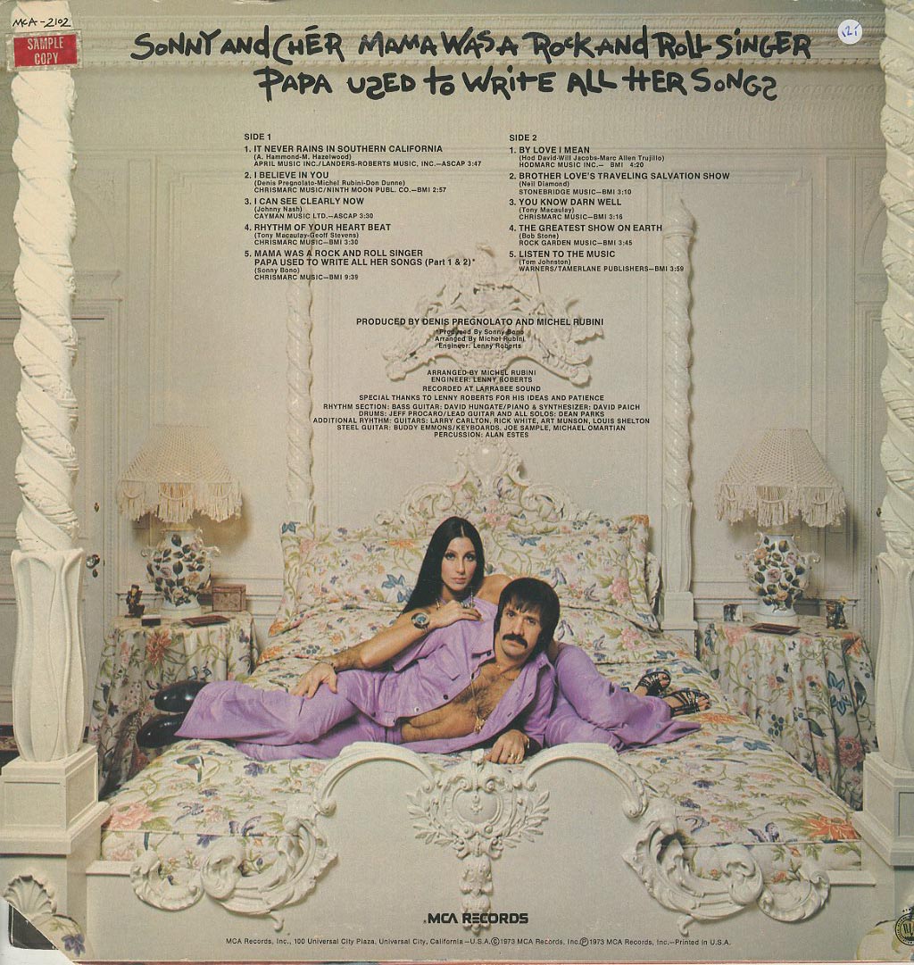 Discographie von Sonny & Cher![]() MCA Records MCA 2102 Sonny & Cher Mama Was A Rock And Roll Singer, Papa Used To Write All Her Songs Eintrag bei DISCOGS (extern) US 1971, LP, Pop/Rock Aufnahme: Stereo Zustand: m- / vg+ (cut out, unten rechts Ecke ab) u.a. It Never Rains in Southern Califiornia, I Can See Clearly Now Diese Platte ist zur Zeit vergriffen. | ![]() Coveransicht: Sonny & Cher - Mama Was A Rock And Roll Singer, Papa Used To Write All Her Songs ![]()