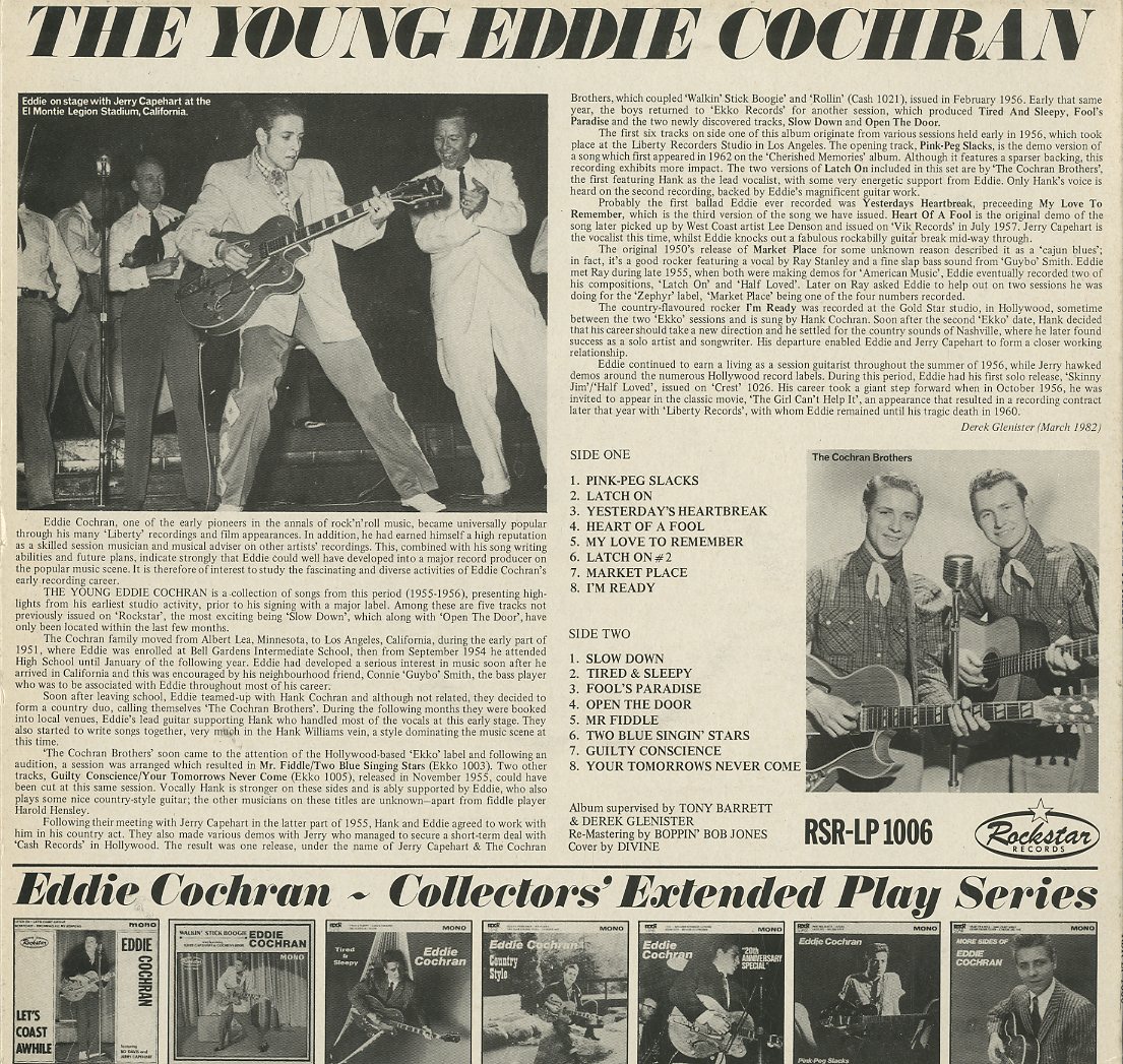 Discographie von Eddie Cochran![]() Rockstar RSR-LP 1006 Eddie Cochran The Young Eddie Cochran Eintrag bei DISCOGS (extern) UK 1982, LP, US-Rock Aufnahme: Mono Zustand: m- / mint - Preis in Euro: 7,50 € Verfügbarkeitsanfrage | ![]() Coveransicht: Eddie Cochran - The Young Eddie Cochran ![]()
