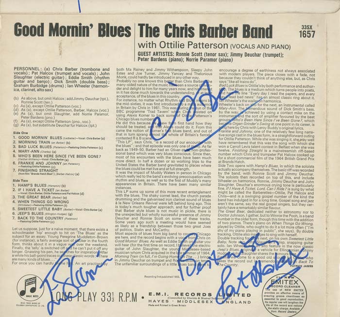 Discographie von Chris Barber![]() Columbia 33 SX 1657 Chris Barber Good Morning Blues Eintrag bei DISCOGS (extern) UK 1965, LP, Jazz Aufnahme: Mono Zustand: vg+ z.T. with Ronnie Scott (Morning Train, Hamp´s Blues) und Ottilie Patterson (Bad Luck Blues, If I Have a Ticked, Back To The Country) Autogramme auf Cover-Rückseite Diese Platte ist Bestandteil meiner Top 100. Nicht verkäuflich. | ![]() Coveransicht: Chris Barber - Good Morning Blues ![]()