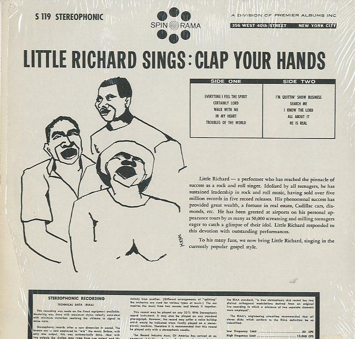 | Discographie von Little Richard SPIN-O-RAMA S 119 Little Richard Little Richard Sings Clap Your Hands Review der Schallplatte (extern) Eintrag bei DISCOGS (extern) US RI 1967 (Orig. 1965), LP, US-Rock Aufnahme: Stereo Zustand: vg+ + / m- (Cover noch in Zellophan) u.a. Everytime I Feel The Spirit, I Am Quittin Show Business, He Is Real (Aufn. 1959) several religious cuts were recorded in the summer of 1959 in New York City and released by different labels (End, Goldisc, Coral, Spin O Rama). The recordings are considered miserable...., Diese Platte ist zur Zeit vergriffen. | ![]() Coveransicht: Little Richard - Little Richard Sings Clap Your Hands ![]()