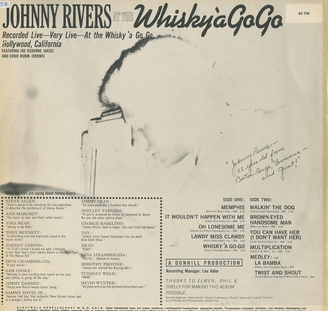 Discographie von Johnny Rivers![]() Liberty L 83 735 Johnny Rivers Johnny Rivers At The Whiskey a Go Go Eintrag bei DISCOGS (extern) D 1964, LP, US-Rock Aufnahme: Mono Zustand: vg / vg+ Erste LP mit Memphis Recorded live in Hollywoods Whisky a Go Go Johnny Rivers: guitar and vocals Joe Osborne: bass Eddie Rubin: drums Preis in Euro: 3,00 € Verfügbarkeitsanfrage | ![]() Coveransicht: Johnny Rivers - Johnny Rivers At The Whiskey a Go Go ![]()