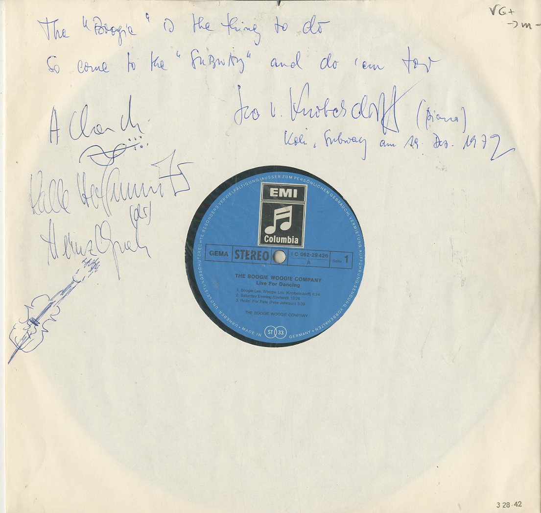 Discographie von Boogie Woogie Company![]() EMI Columbia 1 C 062-29426 Boogie Woogie Company Live For Dancing Eintrag bei DISCOGS (extern) D 1971, LP, Jazz Aufnahme: Stereo Zustand: vg+ bis m- / mint - mit Watermelon Man, Swanwee River Subway Train u.a., Recorded Live 1971 at Subway, Cologne mit Autogrammen auf Innenhülle (1972) Preis in Euro: 6,00 € Verfügbarkeitsanfrage | ![]() Coveransicht: Boogie Woogie Company - Live For Dancing ![]()