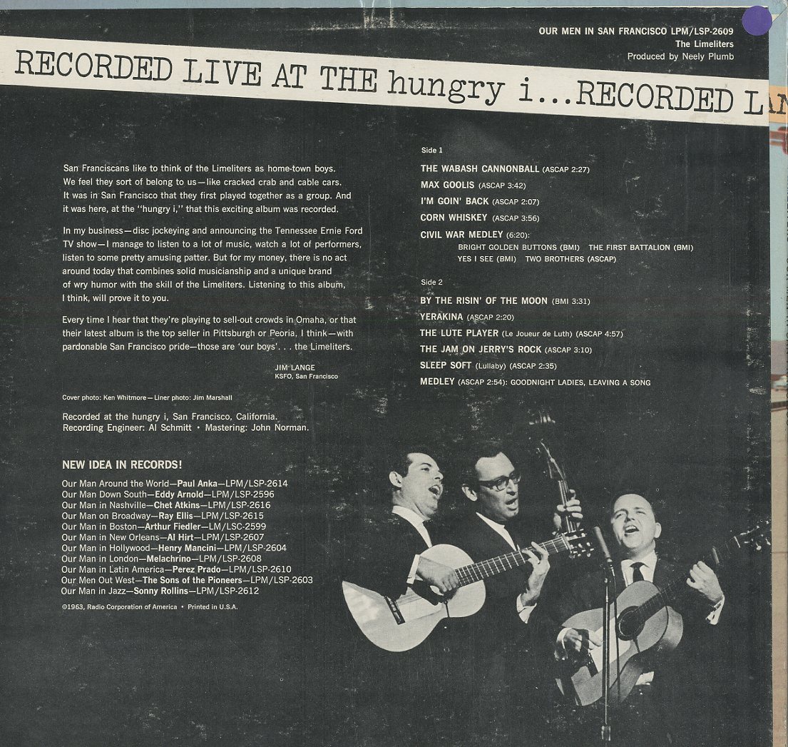 ![]() RCA Victor LSP 2609 Limeliters Our Men In San Francisco Eintrag bei DISCOGS (extern) US 1963, LP, C&W/Folk Aufnahme: Mono Zustand: vg+ bis m- / vg+ (oben etwas ausgebeult)(Foto) Live Recording At The Hungry i, San Francisco, mit The Wabash Cannonball, Civil War Medley, Sleep Soft u.a. Preis in Euro: 4,50 € Verfügbarkeitsanfrage | ![]() Coveransicht: Limeliters - Our Men In San Francisco ![]()