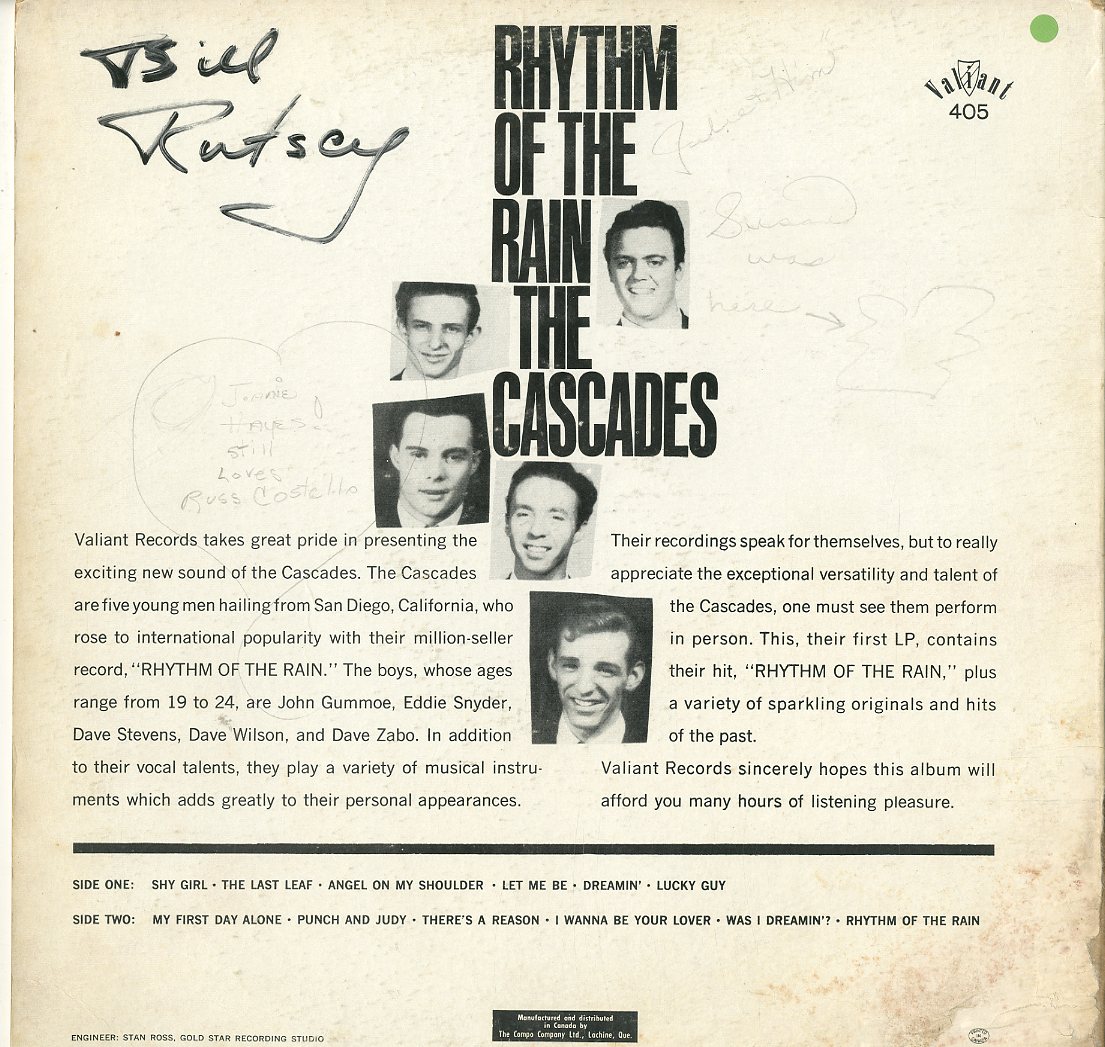 Discographie von The Cascades![]() Warner Brothers W 405 The Cascades Rhythm Of The Rain Eintrag bei DISCOGS (extern) CA 1963, LP, US-Rock Aufnahme: Mono Zustand: vg- / g+ (Rücks. unten besch.) sowie Dreamin u.a. Preis in Euro: 2,50 € Verfügbarkeitsanfrage | ![]() Coveransicht: The Cascades - Rhythm Of The Rain ![]()