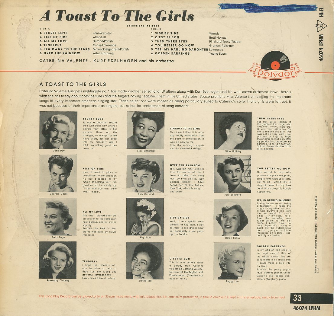 Discographie von Caterina Valente![]() Polydor 46 074 LPHM Caterina Valente A Toast To The Girls (mit Orchester Kurt Edelhagen) Eintrag bei DISCOGS (extern) D 9.58, LP, Easy Listening Aufnahme: Mono Zustand: vg- / vg mit Secret Love, Over The Rainbow, Side By Side, C´est Si Bon, Yes My Darling Daughter u.a,. (teilw. mit Silvio Francesco) Diese Platte ist Bestandteil meiner Top 100. Nicht verkäuflich. | Coveransicht: Caterina Valente - A Toast To The Girls (mit Orchester Kurt Edelhagen) ![]()