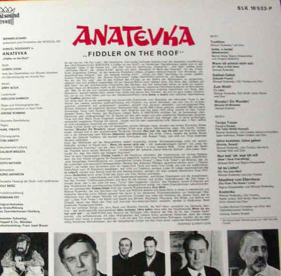 ![]() Decca 25121 Special Ed, Fiddler on the Roof (Anatevka) Anatevka D , LP, Soundtracks Aufnahme: Stereo Zustand: vg+ Deutsche Originalaufnahme der Erstaufführung des Oprettenhauses Hamburg mit Shmuel Rodensky Diese Platte ist noch nicht ausgezeichnet. Stellen Sie einePreisanfrage. | ![]() Coveransicht: Fiddler on the Roof (Anatevka) - Anatevka ![]() |