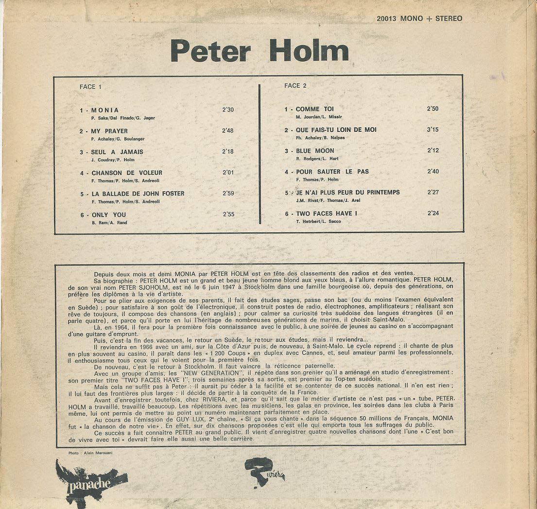 ![]() Barclay 20013 Peter Holm Monia Eintrag bei DISCOGS (extern) CA 1968, LP, International Aufnahme: Mono/Stero Zustand: vg+ / vg+ sowie My Prayer, Only You, Blue Moon, Seul a jamais, La ballade de John Foster u.a. Preis in Euro: 7,00 € Verfügbarkeitsanfrage | ![]() Coveransicht: Peter Holm - Monia ![]()