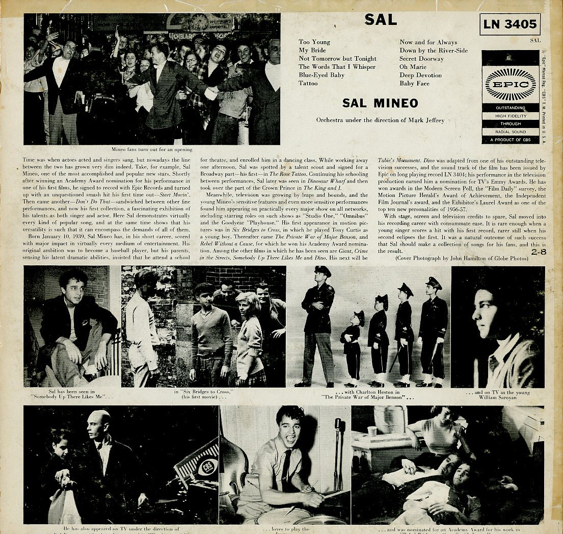 Discographie von Sal Mineo![]() Epic LN 3405 Sal Mineo Sal Eintrag bei DISCOGS (extern) CA 1958, LP, US-Rock Aufnahme: Mono Zustand: vg (+) / vg (+) u.a. Too Young, Blue Eyed Baby, Down By the Riverside, Baby Face Diese Platte ist zur Zeit vergriffen. | ![]() Coveransicht: Sal Mineo - Sal ![]()