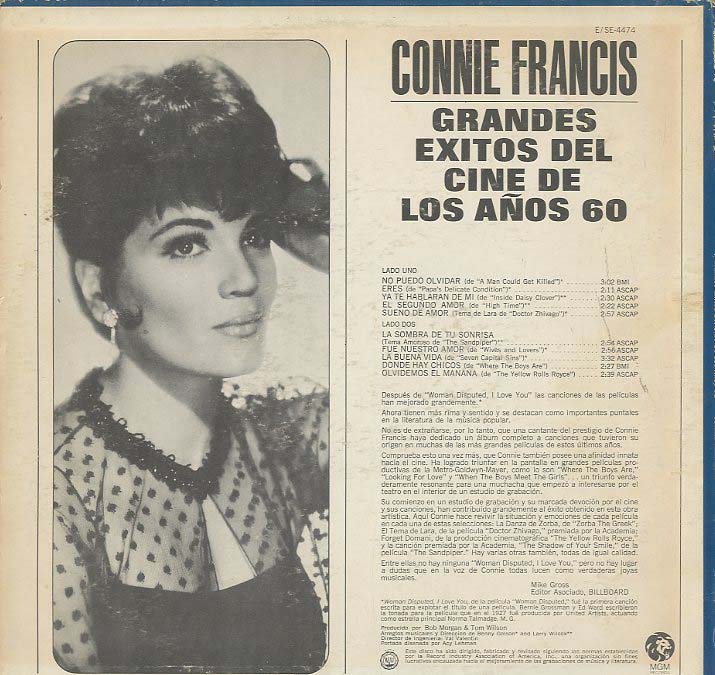 Discographie von Connie Francis![]() MGM SE 4474 Connie Francis Grande Exitos Del Cine De Los Anos 60 US 1966, LP, International Aufnahme: Stereo Zustand: vg (auf Spanisch)u.a. Suendo De amor (Doctor Zhivago), Donde Hay Chicos(Where The Boys Are) diesselben Titel auf Englisch: Movie Greats of The 60s 1966 Diese Platte ist noch nicht ausgezeichnet. Stellen Sie einePreisanfrage. | ![]() Coveransicht: Connie Francis - Grande Exitos Del Cine De Los Anos 60 ![]()