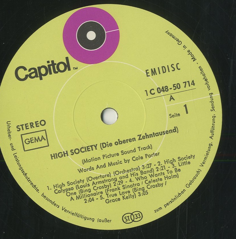 ![]() Capitol emidisc 048 -50 714 High Society (Bing Crosby, Grace Kelly, Frank Sinatra) High Society (Die oberen Zehntausend) D RI 1970, LP, Soundtracks Aufnahme: Stereo Zustand: vg+ / vg+ Motion Picture Soundtrack,Words amd Music by Cole Porter,Rückseite Hig Soiciety Film 1956 emidisc auf Label rechts Preis in Euro: 4,50 € Hörprobe zum Zustand der Schallplatte Verfügbarkeitsanfrage | ![]() Coveransicht: High Society (Bing Crosby, Grace Kelly, Frank Sinatra) - High Society (Die oberen Zehntausend) ![]()