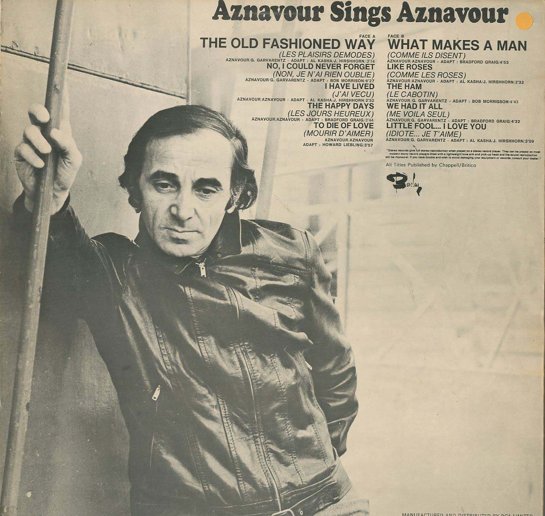 Discographie von Charles Aznavour![]() Barclay 80472 Charles Aznavour Aznavour Sings Aznavour Vol. 3 (Engl.) Eintrag bei DISCOGS (extern) UK 1972, LP, Easy Listening Aufnahme: Stereo Zustand: vg (+) / vg (+) u.a. The Old Fashioned Way, No I Could Never Forget, What Makes A Man, We Had It All, Little Fool I Love You Preis in Euro: 4,00 € Verfügbarkeitsanfrage | ![]() Coveransicht: Charles Aznavour - Aznavour Sings Aznavour Vol. 3 (Engl.) ![]()