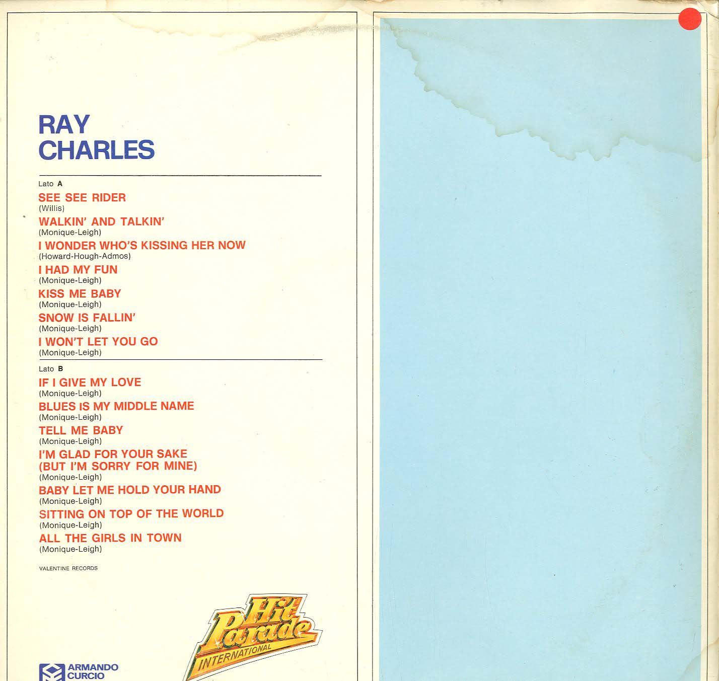 Discographie von Ray Charles Hitparade International (Armando Curcione Editione) HP 29 Ray Charles Hitparade International Eintrag bei DISCOGS (extern) IT 1982, LP, R&B/Soul/Blues Aufnahme: Mono Zustand: m- / vg (Wasserfleck, Rücks. und teilw. innen)) u.a. See See Rider, I Had My Fun, Blues is My Middle Name Klappcover mit 12 Seiten Booklet mit vielen Farbfotos + ital. Text Preis in Euro: 5,00 € Verfügbarkeitsanfrage | ![]() Coveransicht: Ray Charles - Hitparade International ![]()