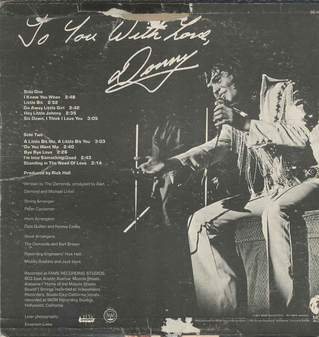 Discographie von Donny Osmond![]() MGM SE 4797 Donny Osmond To You With Love, Donny Eintrag bei DISCOGS (extern) US 1971, LP, Pop/Rock Aufnahme: Stereo Zustand: vg / vg- 2. LP mit Go Away Little Girl, A Little Bit Me, A Little it You, Bye Bye Love, Im Into Something Good u.a.m. Preis in Euro: 2,00 € Verfügbarkeitsanfrage | ![]() Coveransicht: Donny Osmond - To You With Love, Donny ![]()
