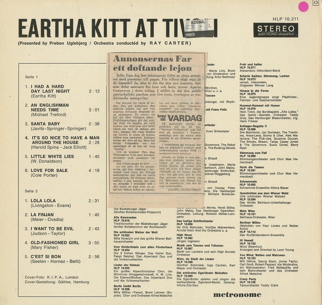 Discographie von Eartha Kitt![]() Metronome HLP 10.211 Eartha Kitt At Tivoli Eintrag bei DISCOGS (extern) D 1962, LP, Easy Listening Aufnahme: Stereo Zustand: vg+ / vg+ u.a. I Had A Hard Day Last Night, An Englishman Needs Time, Santa Baby, Old Fashioned Girl, Cest Si Bon u.a.m. Preis in Euro: 6,00 € Verfügbarkeitsanfrage | ![]() Coveransicht: Eartha Kitt - At Tivoli ![]()