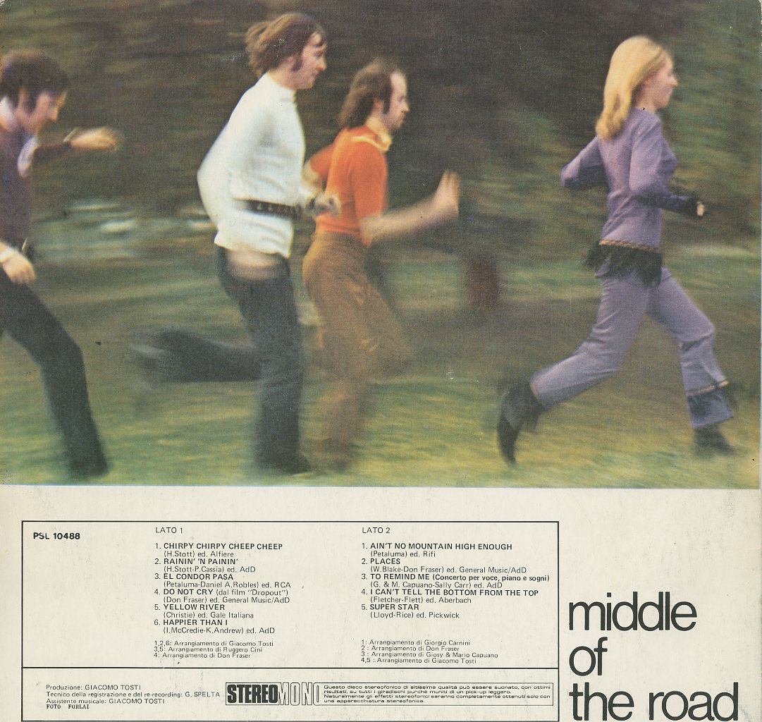 Discographie von Middle Of The Road RCA Italiana (hellblau) PSL 10488 Middle Of The Road Middle Of the Road Eintrag bei DISCOGS (extern) IT 3/71, LP, Pop/Rock Aufnahme: Stereo Zustand: vg+ (knackt ein paar mal) / vg++ Erste LP mit Chirpy Chirpy Cheep Cheep, Yellow River, El Condor Pasa (ital.), Ain´t No Mountain High Enough u.a.m. Diese Platte ist Bestandteil meiner Top 100. Nicht verkäuflich. | ![]() Coveransicht: Middle Of The Road - Middle Of the Road ![]()