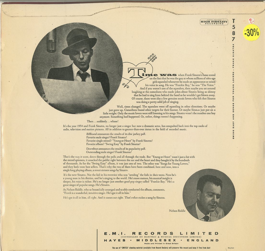 Discographie von Frank Sinatra![]() Capitol Records T 587 Frank Sinatra Swing Easy - Eintrag bei DISCOGS (extern) UK RI ca. 1960 (Orig. 1956), LP, Easy Listening Aufnahme: Mono Zustand: vg+ / vg+ Reissue des gleichnamigen Albums (1954) + des Albums Songs For Young Lovers (1954) Preis in Euro: 5,00 € Verfügbarkeitsanfrage | ![]() Coveransicht: Frank Sinatra - Swing Easy - ![]()