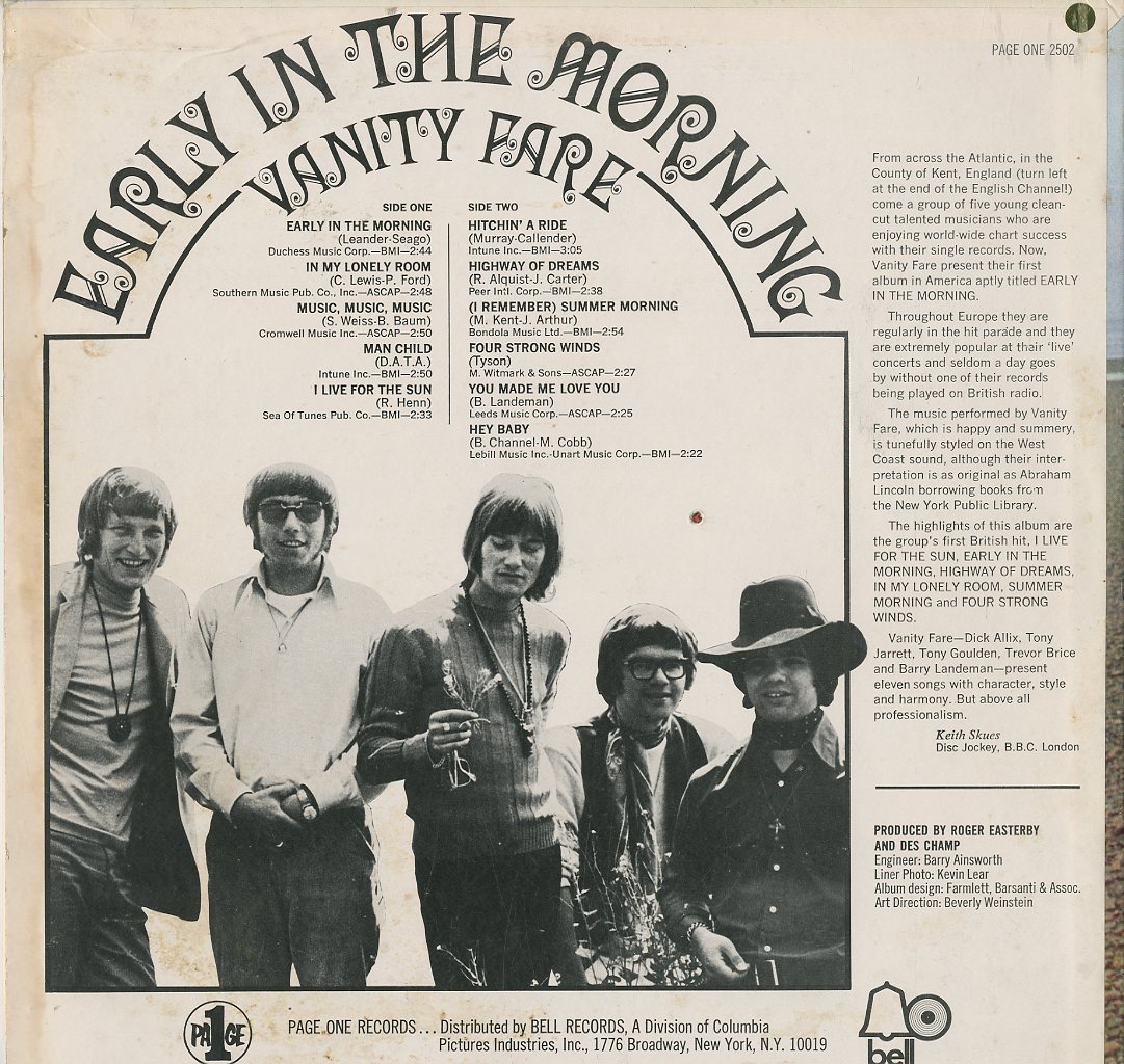 | Discographie von Vanity Fare PAGE ONE 2502 Vanity Fare Early In the Morning Eintrag bei DISCOGS (extern) US 1969, LP, Pop/Rock Aufnahme: Stereo Zustand: vg+ bis m- / vg+ sowie Hitchin A Ride, Highway of Dreams, Hey Baby u.a.m. Diese Platte ist zur Zeit vergriffen. | ![]() Coveransicht: Vanity Fare - Early In the Morning ![]()