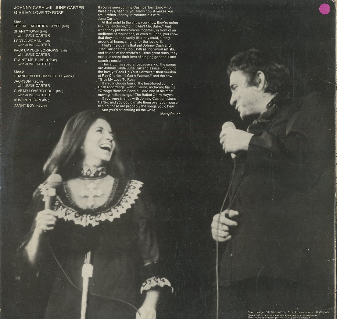 Discographie von Johnny Cash and June Carter![]() CBS S 53114 Johnny Cash and June Carter Give My Love To Rose Eintrag bei DISCOGS (extern) NL 1972, LP, C&W/Folk Aufnahme: Stereo Zustand: vg+ + / vg++ sowie Jasckson, It Aint Me Babe, Danny Boy u.a. Diese Platte ist zur Zeit vergriffen. | ![]() Coveransicht: Johnny Cash and June Carter - Give My Love To Rose ![]()