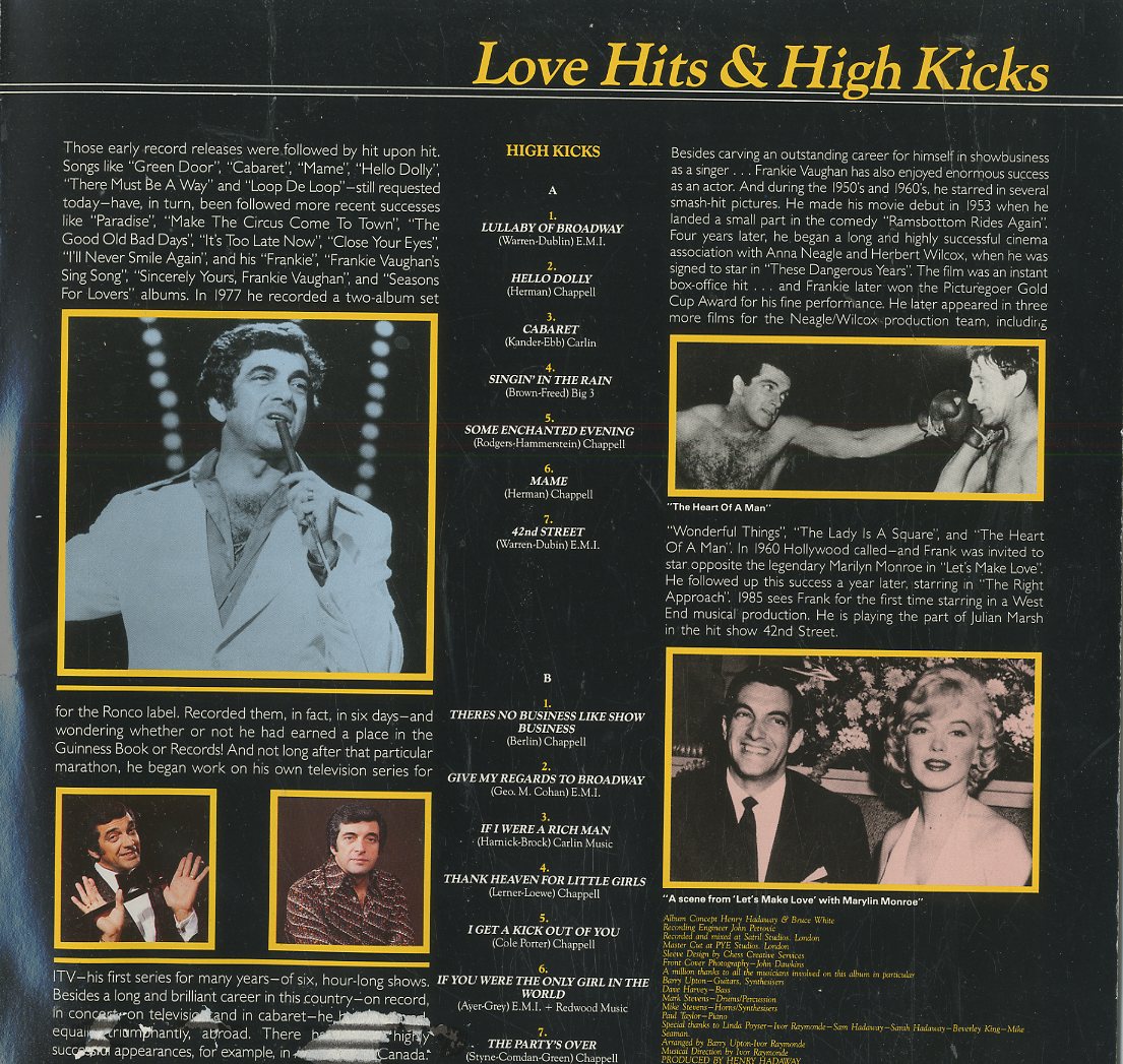 | Discographie von Frankie Vaughan Creole Records FVLP 3 Frankie Vaughan Love Hits And High Kicks (DLP) Eintrag bei DISCOGS (extern) UK 1985, LP, Easy Listening Aufnahme: Stereo Zustand: m- / Cover innen unten beschädigt 28 Track Double Album Featuring Greatest Love Songs with the Best Broadway Classics, u.a. It´s All In The Game, Smoke Gets In Your Eyes, Singin In The Rain Klappcover mit vielen Fotos Verfügbarkeitsanfrage | ![]() Coveransicht: Frankie Vaughan - Love Hits And High Kicks (DLP) ![]()