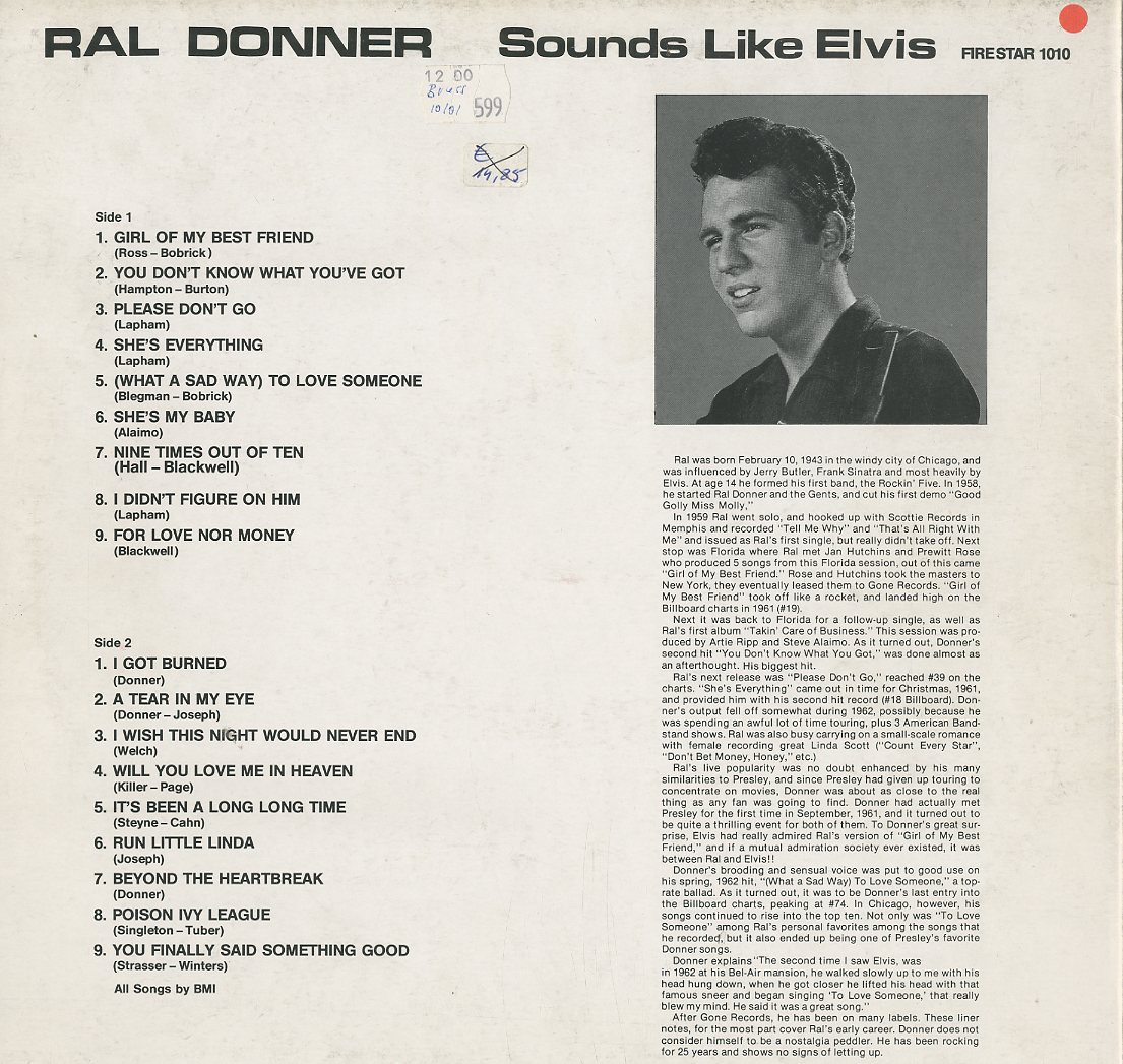 | Discographie von Ral Donner Fire Star 1010 Ral Donner Sounds Like Elvis Eintrag bei DISCOGS (extern) NL 1986, LP, US-Rock Aufnahme: Stereo Zustand: vg+ (an einigen Stellen übersteuert / Cover vg+ (mit Preissticker) incl. Girl Of My Best Friend, Nine Times Out of Ten (mäßige Aufnahmequalität) Diese Platte ist zur Zeit vergriffen. | ![]() Coveransicht: Ral Donner - Sounds Like Elvis ![]()