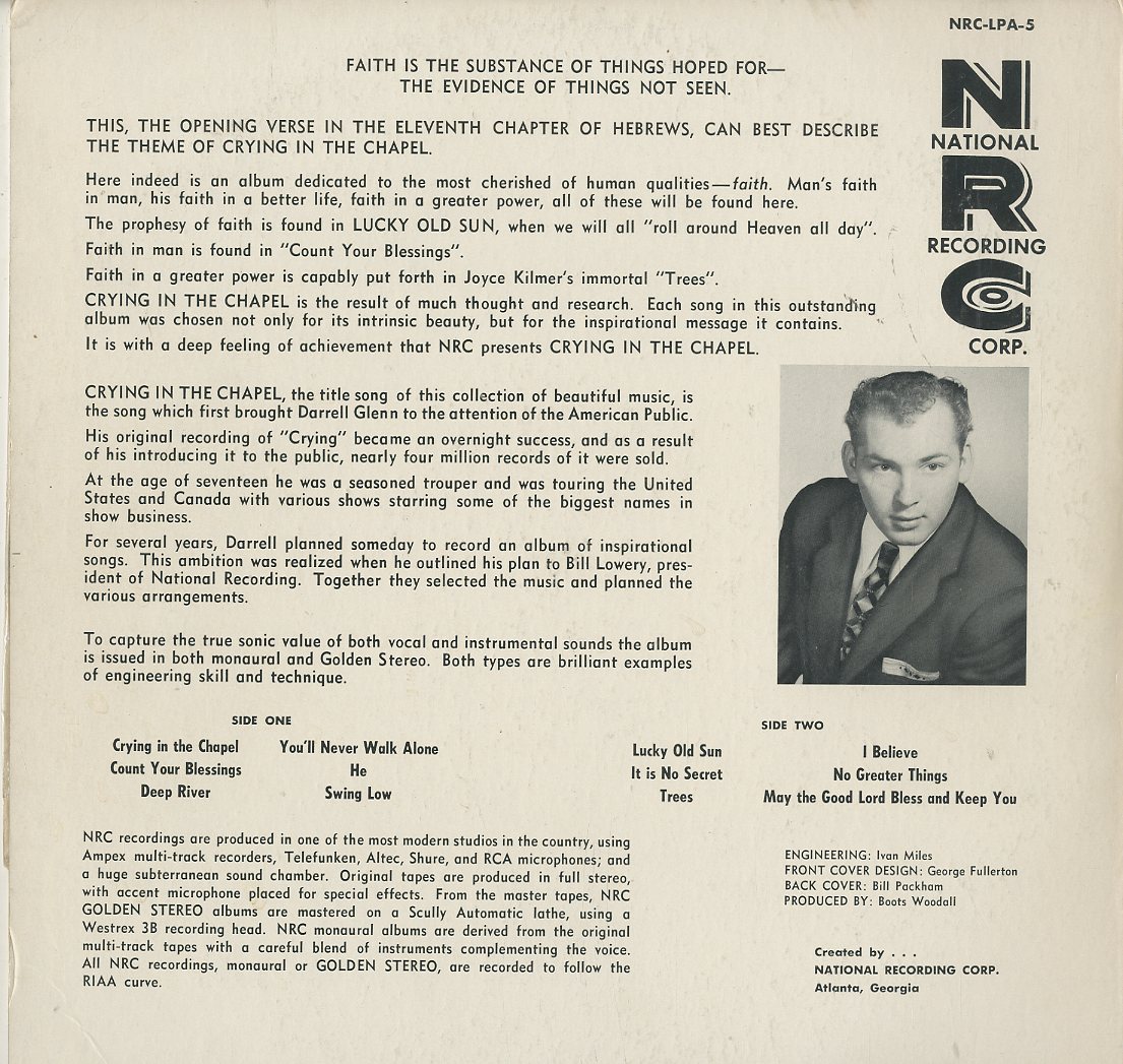 | Discographie von Darrell Glenn National Recording Cop. NRC LPA 5 Darrell Glenn Crying In The Chapel Review der Schallplatte (extern) Eintrag bei DISCOGS (extern) US 1959, LP, C&W/Folk Aufnahme: Stereo Zustand: vg+ / vg+ sowie Deep River, Swing Low u.a.m. Diese Platte ist zur Zeit vergriffen. | ![]() Coveransicht: Darrell Glenn - Crying In The Chapel ![]()