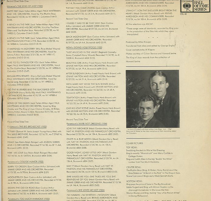 Discographie von Bing Crosby![]() Columbia Hall of Fame Serie C2L 43 Bing Crosby Bing Crosby in Hollywood 1930 - 1934 (DLP) Eintrag bei DISCOGS (extern) US 1967, LP, Easy Listening Aufnahme: Mono u.a. aus den Filmen The King Of Jazz (1930), The Big Broadcast (1932), She Loves Me Not (1934) Klappcover mit Texten und Fotos Diese Platte ist noch nicht ausgezeichnet. Stellen Sie einePreisanfrage. | ![]() Coveransicht: Bing Crosby - Bing Crosby in Hollywood 1930 - 1934 (DLP) ![]()