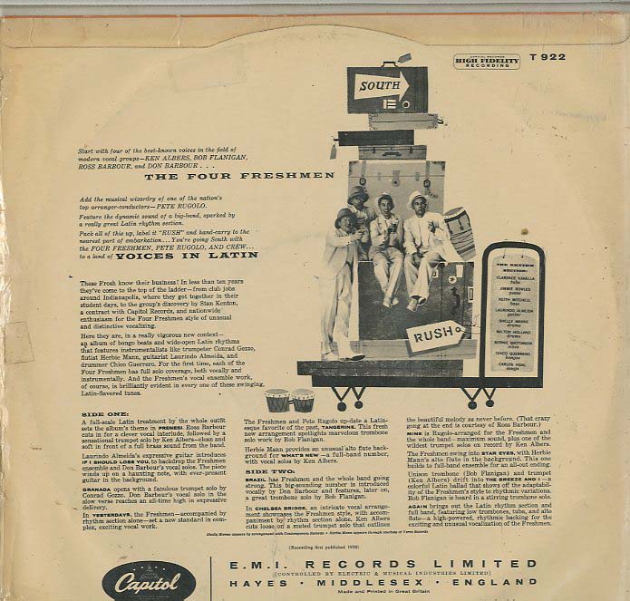 ![]() Capitol T 922 Four Freshmen Voices in Latin US , LP, Easy Listening Aufnahme: Mono Zustand: m- / Cover g (an offener Seite eingerissen, geklebt, zerknittert - s. Foto) mit Frenesi, Granada, Brazil u.a. Preis in Euro: 2,50€ Diese Platte ist noch nicht ausgezeichnet. Stellen Sie einePreisanfrage. | ![]() Coveransicht: Four Freshmen - Voices in Latin ![]()