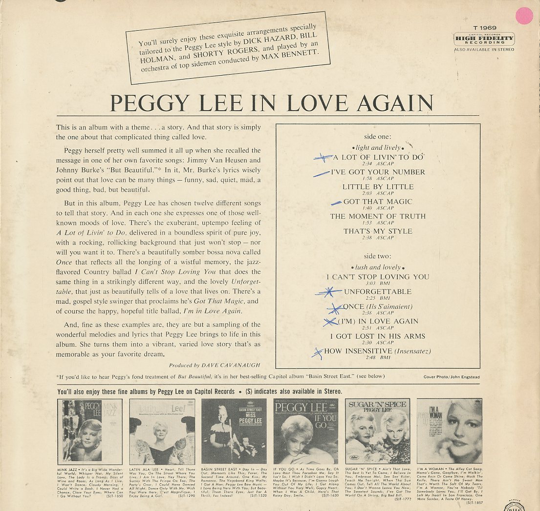 Discographie von Peggy Lee![]() Capitol T 1969 Peggy Lee In Love Again Review der Schallplatte (extern) Eintrag bei DISCOGS (extern) US 1964, LP, Easy Listening Aufnahme: Mono Zustand: vg+ bis m- / vg+. (Rücks. Titel markiert) mit A Lot Of Livin To Do, I Cant Stop Loving You u.a. Preis in Euro: 6,00 € Verfügbarkeitsanfrage | ![]() Coveransicht: Peggy Lee - In Love Again ![]()