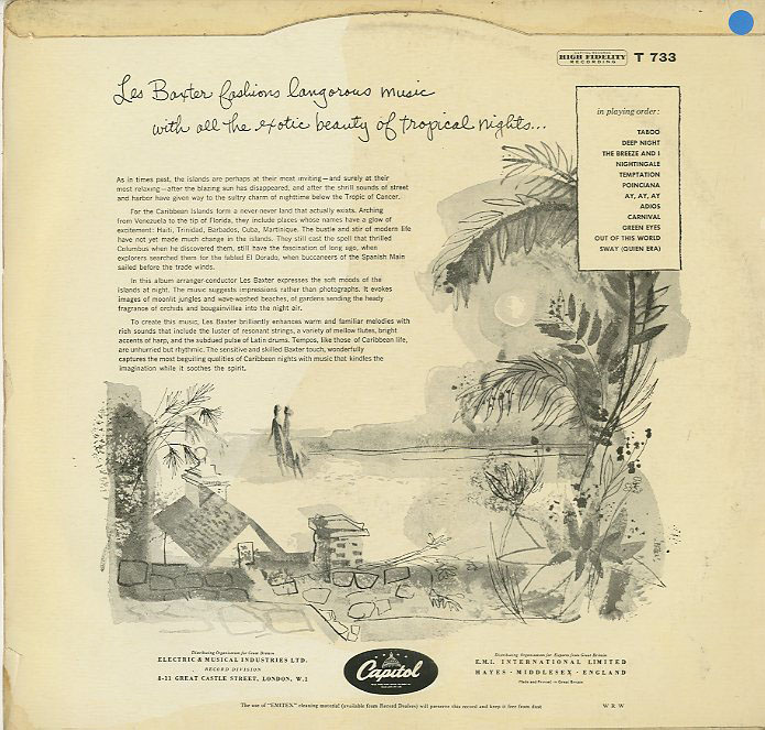 Discographie von Les Baxter![]() Capitol T 733 Les Baxter Carribean Moonlight Eintrag bei DISCOGS (extern) UK 1956, LP, Instrumental Aufnahme: Mono Zustand: vg / vg+ mit The Breeze and I, Temptation, Ay Ay Ay, Sway Preis in Euro: 4,00 € Verfügbarkeitsanfrage | ![]() Coveransicht: Les Baxter - Carribean Moonlight ![]()