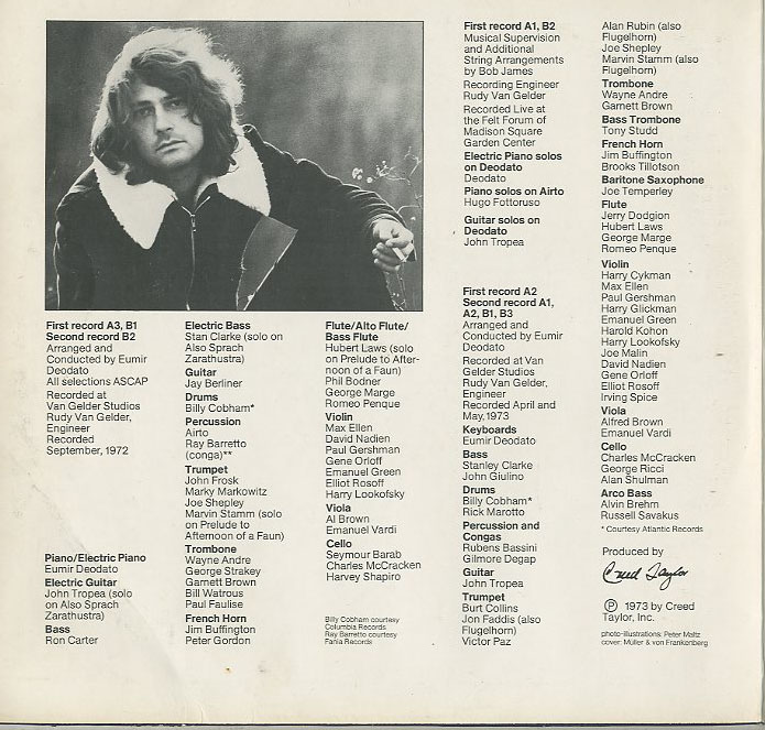 | Discographie von Deodato CTI 0083-003 Deodato Star Edition (DLP) Eintrag bei DISCOGS (extern) D 1973, LP, Instrumental Aufnahme: Stereo Zustand: vg bis vg+ / vg- mit Nights In White Satin, Also sprach Zarathustra, Rhapsody In Blue< (Aufn. Sept. 1972) Klappcover mit Fotos und biogr. Texten im Cover P 1973, Lt. DISCOGS 1978 Preis in Euro: 4,00 € Verfügbarkeitsanfrage | ![]() Coveransicht: Deodato - Star Edition (DLP) ![]()