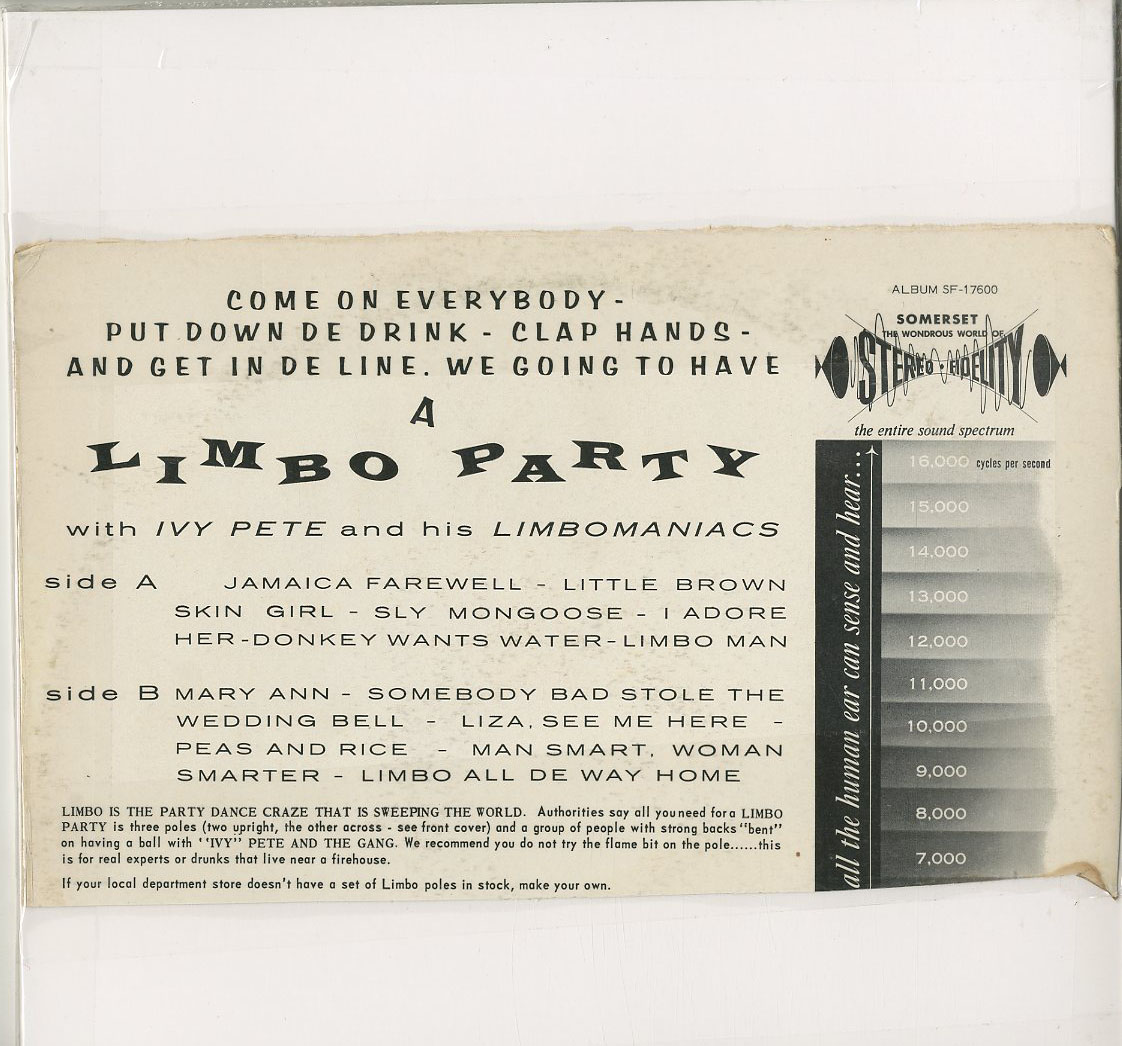| Discographie von Ivy Pete and his Limbomaniacs Somerset SF 17600 Ivy Pete and his Limbomaniacs Limbo Party Eintrag bei DISCOGS (extern) US 1962, LP, Easy Listening Aufnahme: Stereo Zustand: vg bis vg+ / nur Teil augeklebt mit Jamaica Farewell, Mary Ann, Liza See Me Here, Man Smart Woman Smarter u.a. Instruktionen wie nan Limbo Stöcke macht auf Englisch auf Cover Rückseite Sehr guter Stereo-Klang Cover Art Preis in Euro: 2,50 € Verfügbarkeitsanfrage | ![]() Coveransicht: Ivy Pete and his Limbomaniacs - Limbo Party ![]()