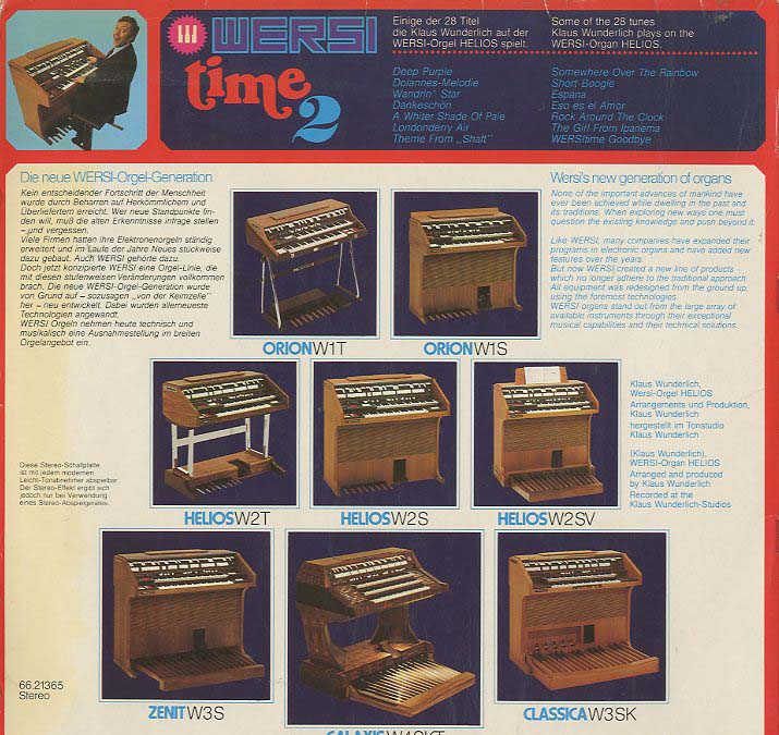 | Discographie von Klaus Wunderlich WERSI 66.21 365-01 Klaus Wunderlich Wersitime 2 - Die Orgel-Generation der Zukunft vorgestellt von Klaus Wunderlich Eintrag bei DISCOGS (extern) D 1977, LP, Instrumental Aufnahme: Stereo Zustand: m- Klappcover mit Einlage zur Einstellung der Orgel bei den versch. Titeln Diese Platte ist noch nicht ausgezeichnet. Stellen Sie einePreisanfrage. | ![]() Coveransicht: Klaus Wunderlich - Wersitime 2 - Die Orgel-Generation der Zukunft vorgestellt von Klaus Wunderlich ![]()