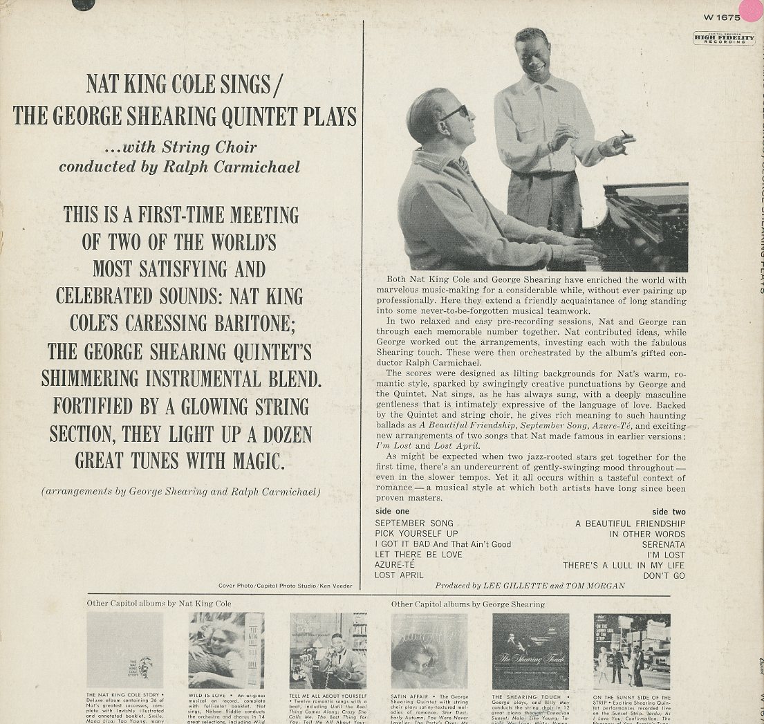 Discographie von Nat King Cole![]() Capitol W 1675 Nat King Cole Nat King Cole Sings / George Shearing Plays with The Qunitett and String Choir Eintrag bei DISCOGS (extern) US 1962, LP, Easy Listening Aufnahme: Mono Zustand: vg+ / vcg++ u.a. September Song, Let There Be Love, Fly Me To the Moon Preis in Euro: 6,00 € Verfügbarkeitsanfrage | ![]() Coveransicht: Nat King Cole - Nat King Cole Sings / George Shearing Plays with The Qunitett and String Choir ![]()