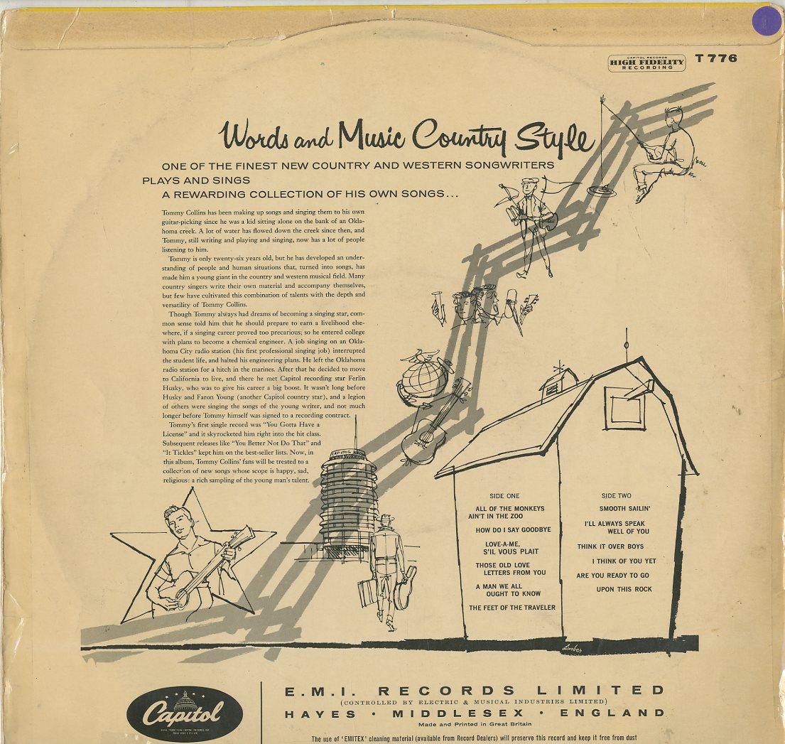 Discographie von Tommy Collins![]() Capitol T 776 Tommy Collins Words and Music Country Style Eintrag bei DISCOGS (extern) UK 1957, LP, C&W/Folk Aufnahme: Mono Zustand: vg+ / vg - One of the finest new Country and Western Songwriters plays and sings a rewarding collection of his own songs Diese Platte ist zur Zeit vergriffen. | ![]() Coveransicht: Tommy Collins - Words and Music Country Style ![]()