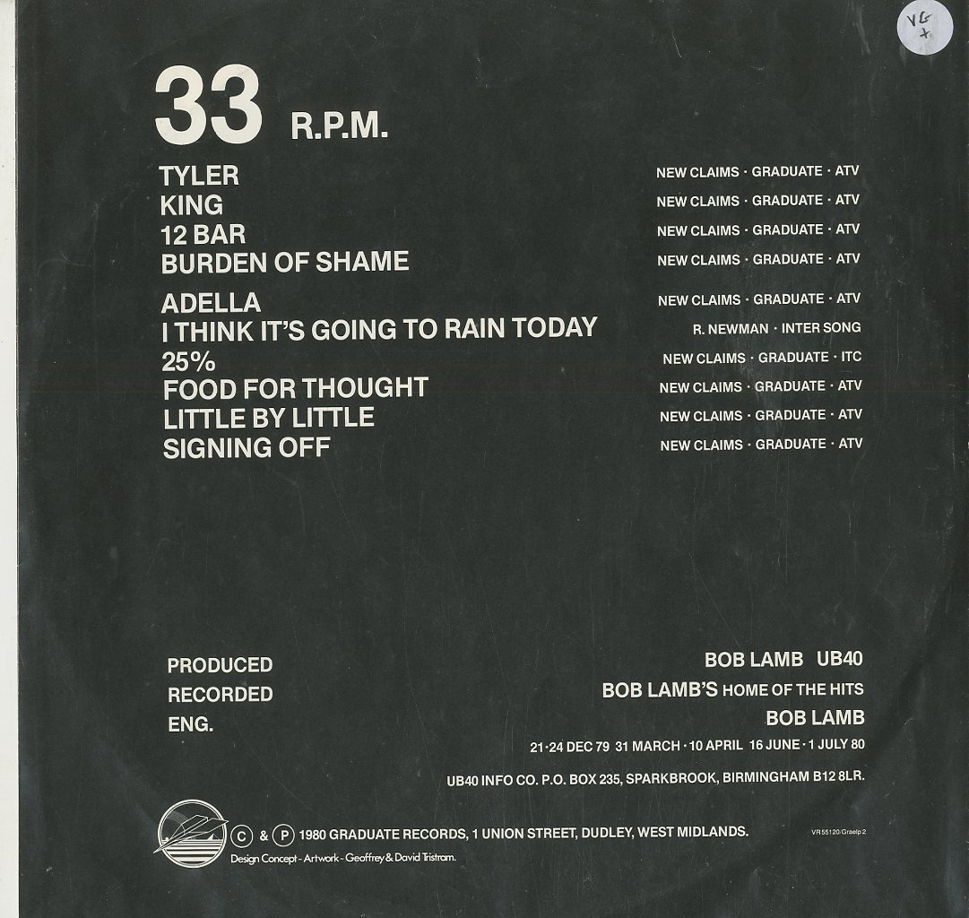 | Discographie von UB40 Graduate Records Sound GRADLP 2 UB40 Signing Off (LP + Maxi Single) Eintrag bei DISCOGS (extern) UK 1980, LP, Pop/Rock Aufnahme: Stereo Zustand: vg+ / vg++ mit I Think It´s Going To Rain Today. Little by Little, Food For Thought u.a. / Maxi Single 45 RPM mit Madam Medusa, Strange Fruit und Refer Madness Diese Platte ist zur Zeit vergriffen. | ![]() Coveransicht: UB40 - Signing Off (LP + Maxi Single) ![]()